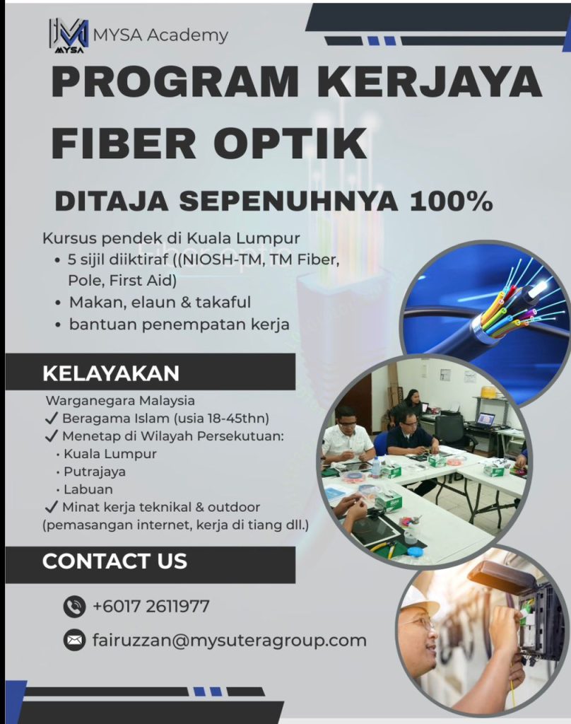 A fully sponsored Fiber Optic Training and Career Program specially designed for Muslims in Kuala Lumpur, Putrajaya, and Labuan who wish to build a better future. Through this program, participants will gain hands-on skills in fiber optic installation and maintenance, obtain up to five industry-recognized certifications, and receive meals, allowances, and takaful coverage throughout the training period. Graduates will also be assisted with job placement, with an estimated starting salary of around RM1,800*. This program is suitable for SPM leavers, job seekers, individuals looking to change careers, and those interested in technical and outdoor work.